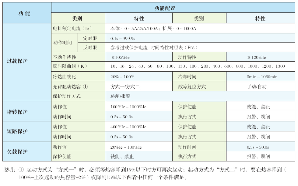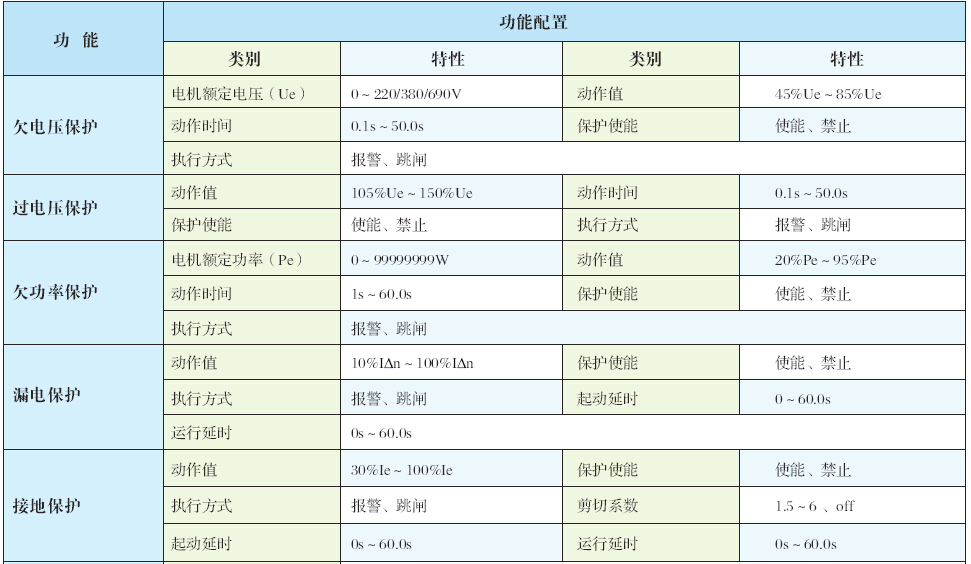 控制器提供了多種保護方式:過載保護、堵轉保護、欠載保護、欠功率保護、相序保護、缺相/不平衡保護、接地保護、漏電保護、欠電壓保護、過電壓保護、過熱保護外部故障保護(工藝聯鎖保護)、起動加速超時保護、最大允許分段電流。