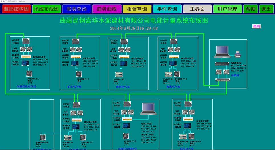 3、各電氣室收集的電能數據通過光纖、交換機等設備傳輸到后臺通訊管理器,最終通過計量計算機進行終端統計顯示。電能計量的通訊管理器放置于工程師站,計量計算機安裝兩臺,一臺放置于總降壓站,一臺放置于中控室。