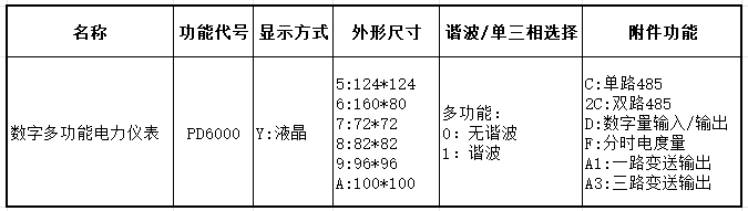 例:PD6000-Y90-CFA1表示96*96結(jié)構(gòu),不帶諧波,RS485通訊,帶變送輸出,帶分時(shí)電度量。