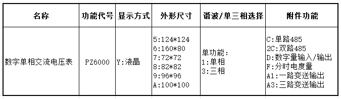 例:PD6000-Y90-CFA1表示96*96結(jié)構(gòu),不帶諧波,RS485通訊,帶變送輸出,帶分時(shí)電度量。